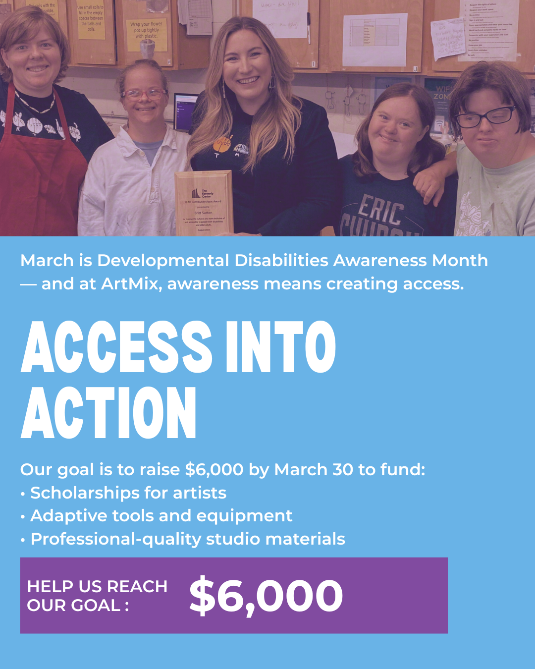 Your support keeps our programs affordable, provides adaptive tools, and ensures that people with disabilities can fully participate in every class, workshop, and gallery experience.